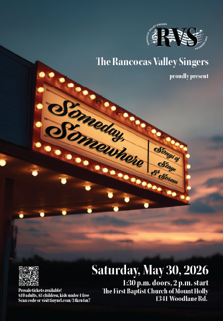 We at Rancocas Valley Singers are so excited to perform our 2026 spring concert “Someday, Somewhere: Songs of Stage & Screen” for you!